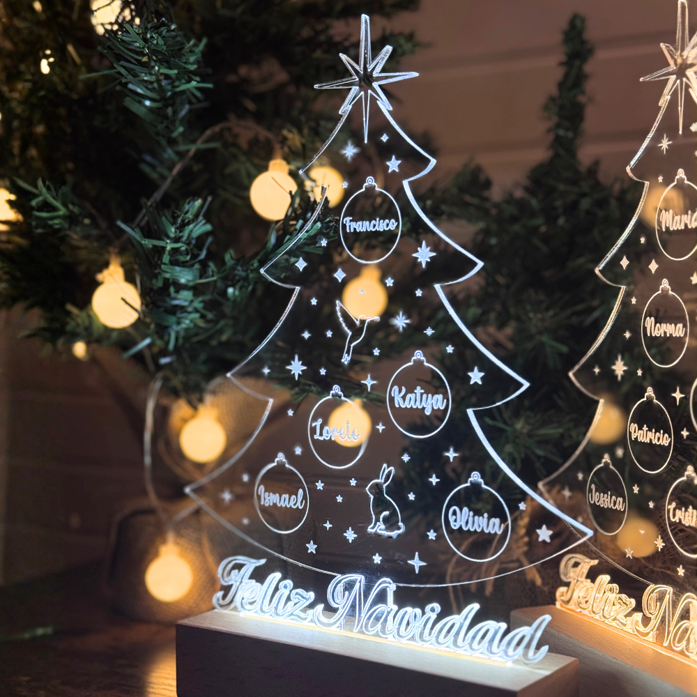 Celebra la magia de la Navidad con un árbol único: grabado con los nombres de tu familia en acrílico iluminado, montado sobre una base de madera con luz LED. Un detalle especial para decorar y compartir en estas fiestas.