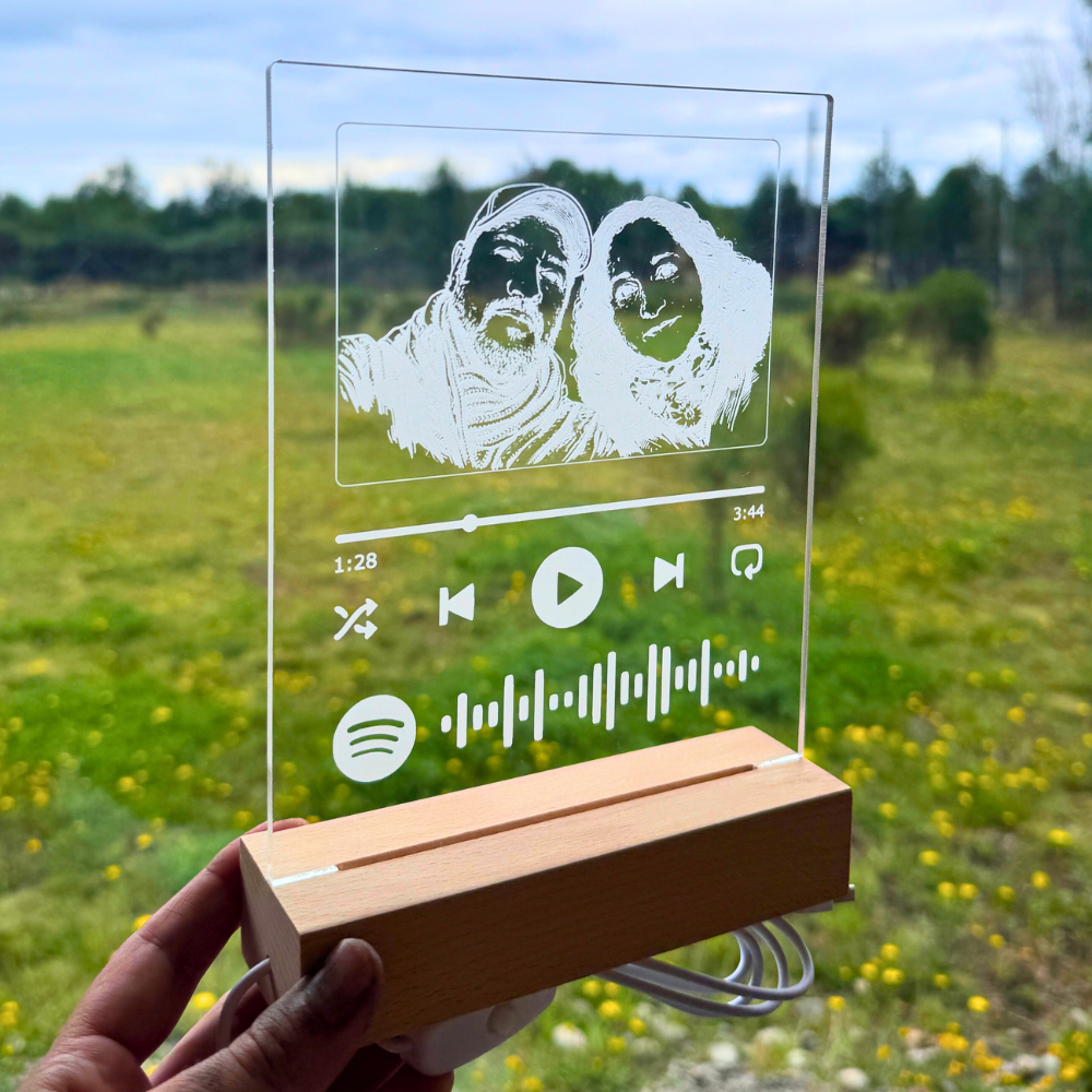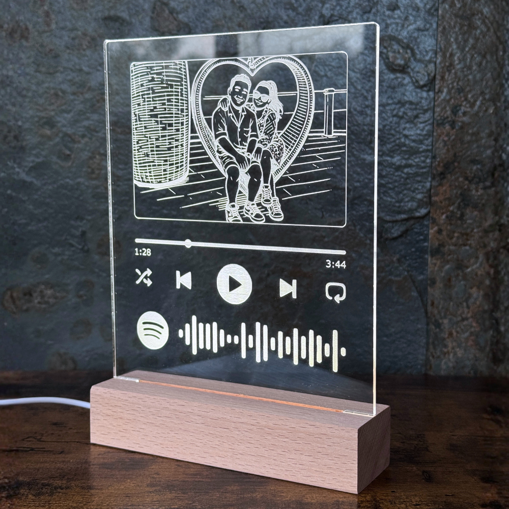 Celebra tus momentos especiales con este cuadro personalizado montado sobre una base de madera con luz LED. Perfecto para los enamorados, familiares o amistades especiales.